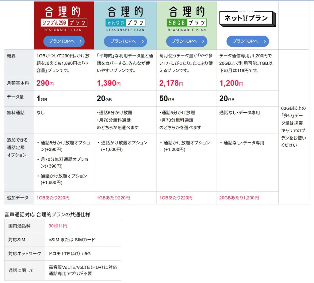 日本通信SIM 20GB 1,390円 50GB 2,178円