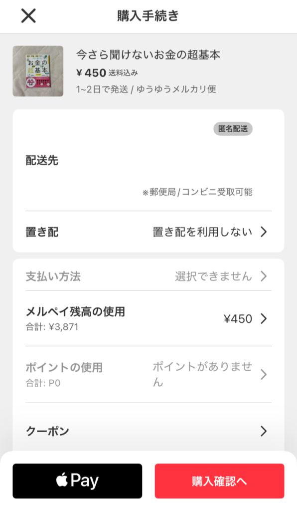 欲しい商品名を検索→画像と値段が表示されるのでその中から選ぶ→他の角度からの画像や商品の使用頻度・状態、説明文を確認→配送先と支払方法を選択
